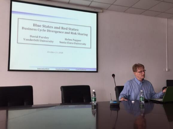 邀请,美国范德堡大学欧文商学院David Parsley教授在仙林校区德经楼308会议室作了题为“Blue States and Red States: Business Cycle Divergence and Risk Sharing”(“蓝州”和“红州”:商业周期差异与风险分担)的讲座。讲座由一本道