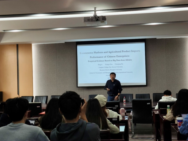 邀请,中山大学李兵教授在仙林校区德经楼308会议室作了题为E-commerce Platform and Agricultural Product Imports Performance of Chinese Enterprises: Em-pirical Evidence Based on Big Data from Alibaba的学术讲座,讲座由一本道