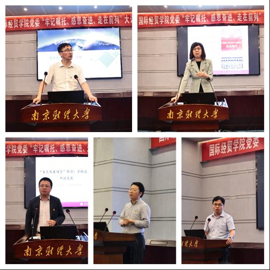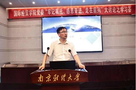 围绕“创新”主题,余泳泽教授指出创新是引领发展的第一生产力,我国加快高水平科技自立自强步伐要立足“有为政府”;要强化“有效市场”,发挥我国超大规模市场优势;要优化创新主题,打造大中小企业融通创新生态系统;要加强需求导向,形成产业链与创新链的融通机制;要完善评价机制,加强对基础研究的创新支持。当前,身在高校教育战线的我们一定要坚持用创新的思维去开展科学研究,提升人才培养质量。围绕“协调”主题,唐保庆教授指出协调是持续健康发展的内在要求。他勾勒了未来推动协调发展的战略走向,提出要增强大局意识提高发展系统性,增强协同意识提高发展耦合性,增强补短意识提高发展均衡性。作为教育科研工作者,要积极开展协调问题的研究,注重组织的协调性开展工作。围绕“绿色”主题,夏勇博士认为绿色是构建高质量现代化经济体系的必然要求,是永续发展的必要条件,绿色金融是生态文明建设的重要途径。他提出要以数字化方式探索“绿水青山”与“金山银山”结合的模式,积极推进美丽校园建设。围绕“开放”主题,陈启斐副教授认为开放是国家繁荣发展的必由之路。现阶段国家在加快建设贸易强国,吸引高质量外资,推动一带一路高质量发展,扩大面向全球的高标准自由贸易网络,构建内外联动的循环经济体系,鼓励民营经济。我们要坚持外向型思维,为国内国外双循环做出应有贡献。围绕“共享”主题,胡雅蓓教授认为共享是中国特色社会主义的本质要求。共享是渐进的共享,共享的过程也是共建的过程,要坚持从具体国情出发,立足经济社会发展水平,最终必将实现全体人民共同富裕的目标。我们既是高校美丽校园的参与者,同样也是受益者,大家要齐心协力,为建设一个共建、共治、共享的美丽校园而共同努力。