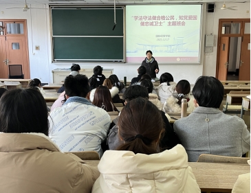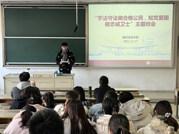 国际商务21研于博远楼108教室开展以“学法守法做合格公民,知党爱国做忠诚卫士”为主题的班会,本次会议由研究生辅导员张东霞主持,国际商务21研全体研究生参加。