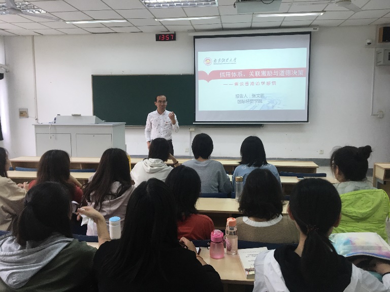 张文武副教授在我校仙林校区Z1-202教室作了题为“信用体系、关联激励与道德决策——兼谈香港访学感悟”的讲座。一本道