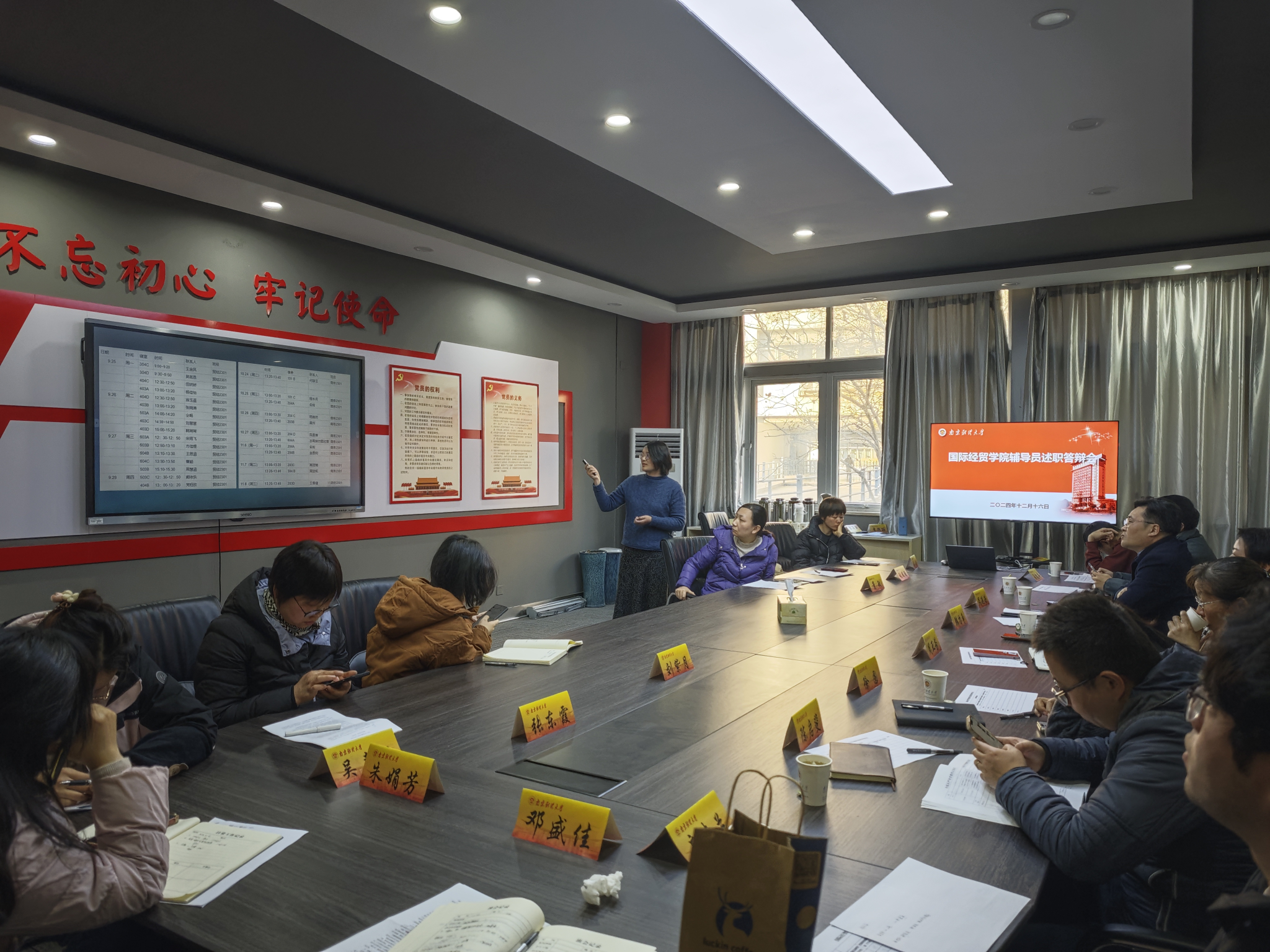 2023-2024学年辅导员述职答辩交流会在德经楼206会议室举行,学院7名本科生辅导员和1名研究生辅导员进行了现场答辩述职交流。党委学生工作部部长、学生处处长韩立争和学院领导班子成员担任评委。答辩会由一本道