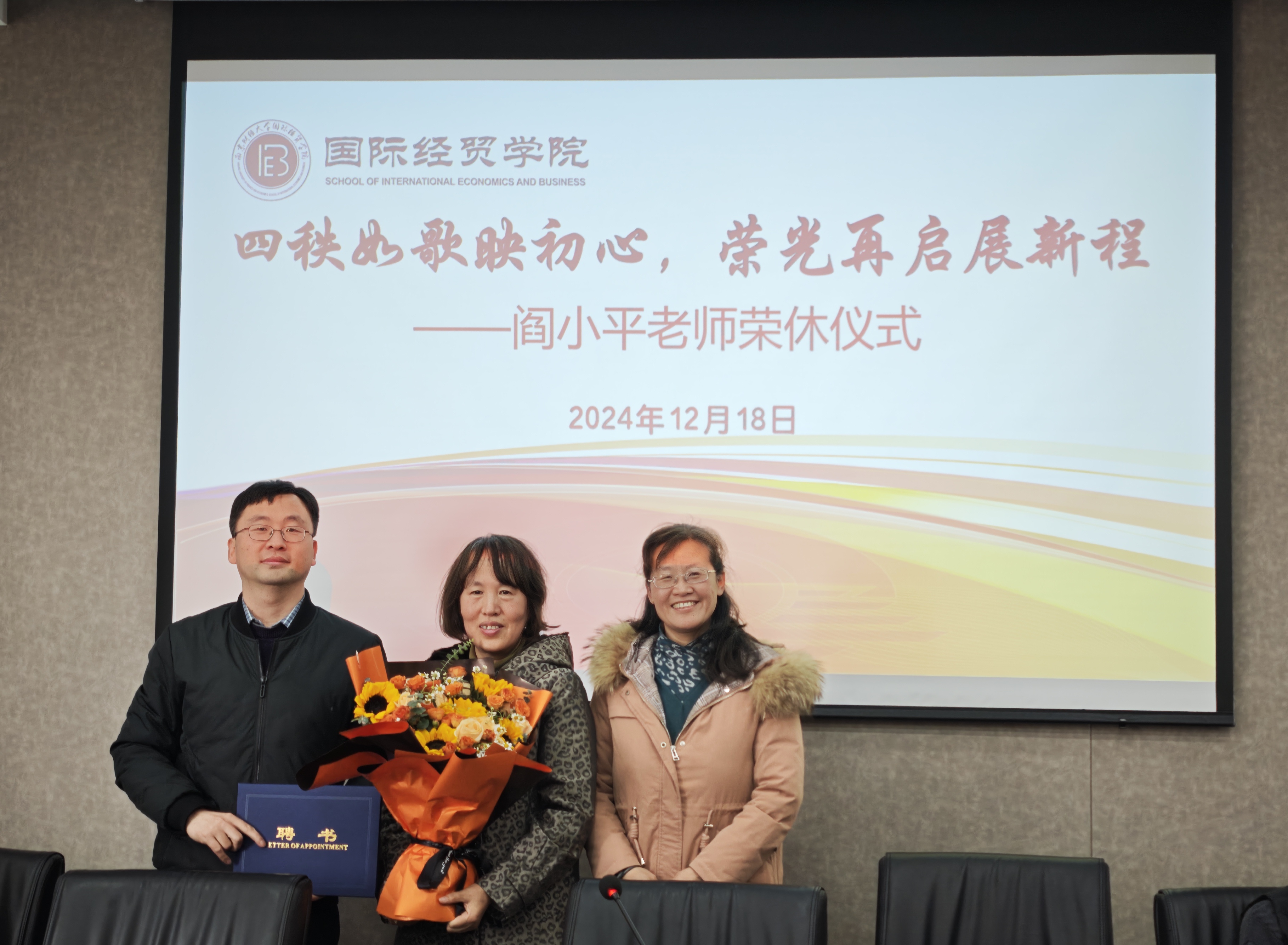 祝福无限,余热生辉。余泳泽院长深情寄语,感谢阎老师将自己的美好岁月和满腔热情都奉献给了国贸院,希望她能继续关心支持学院的建设发展和年轻教师的成长,并祝愿阎老师健康快乐,在人生的新赛道上开启美丽新篇章。