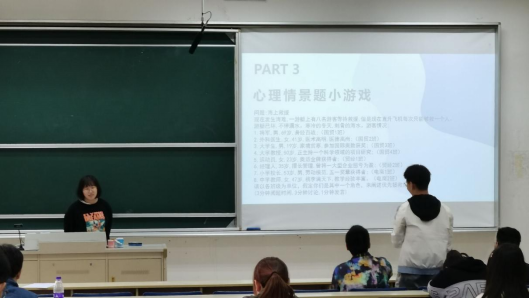 本次培训活动主要分为四个部分进行:大学生常见心理问题、沟通技能提升方法、心理情景题小游戏和日常工作培训。活动过程中,主持人介绍了新生初入大学,在大学里常见的心理问题以及应对心理问题的一些解决方式和沟通方法。在“干货”之间,还穿插了有趣的心理情景题小游戏,心理委员们将自己代入角色,积极为自己争取救援机会,大家从不同角度出发,依次发言,为自己的角色阐述“救援”理由,现场讨论得十分热烈。心协成员曹家伟同学总结道:“代入角色,体会每个人珍贵的价值,让我们更能换位思考。”最后,院心协会长尹帆同学为大家介绍了心理委员的日常工作,包括十佳心理委员、第二课堂学分认证等方面,加深了新生心理委员对日常举办心理活动的了解,便于各项工作的开展。