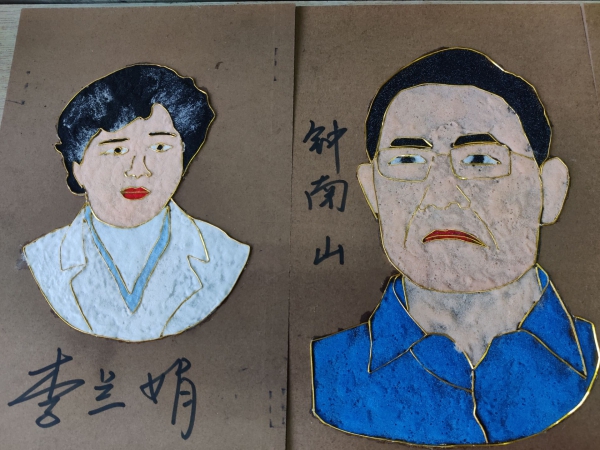活动当天,彩砂、胶水等材料早已被同学们有序地摆放在桌上。同学们发挥自己的想象力,在预先准备好的底板上画出心目中重阳英雄的模样,随后用针管小心翼翼地将胶水涂在线条上。制作过程中,颇有难度的就是粘金丝环节。粘金丝时,相对于女生流利的动作,男生粘的更为小心谨慎,一边用镊子固定住金丝,一边用手根据底板上的轮廓,灵巧地掐出人物的各个流畅“线条”,生动地展示出人物的表情神韵,国贸1902班徐成龙同学表示:“疫情期间,李兰娟院士用挺拔又柔弱的身躯与死神对抗,抢回了一条又一条鲜活的生命。其心若兰,心济苍生。我觉得通过沙画将自己心中的重阳英雄表现出来,向他们致敬,是非常有意义的。”除金丝外,彩砂也是必需的原料。它结合现代人的审美观,依托深厚的文化底蕴和文化内涵。最后给图案填充彩砂的时候,女同学倍加细心,用铲子将一颗颗彩砂放到对应的位置,由于太认真以至于手在不断地颤抖。填充完彩砂后,她还特地用铲子将彩砂均匀分布,五彩斑斓的彩砂与栩栩如生的线条,充分展示出人物形象。“钟南山院士84岁,李兰娟院士73岁,张伯礼院士72岁,就连年龄比较小的陈薇院士也已经54岁了。国家有难,挺身而出,即使年过半百也无法灭心中为国为民之火。英雄为我们付出了很多,在这个节日我想英雄的飒爽英姿展示出来。”国实2001班李林风同学激动地说道。