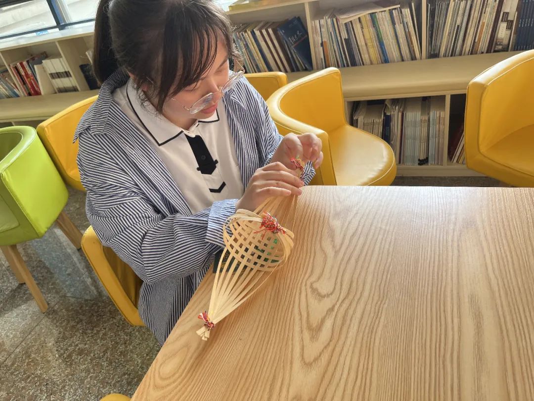 竹编作为一项传统手艺,有着深厚的历史底蕴,凝结了劳动人民浓浓的智慧。同学们先是按照编织的一般步骤将龙舟的舟身编制好,将两端多余的部分修剪完成,并用彩线将两端固定牢;紧接着将对端午的美好祝愿书写在便签上,将其制作成小挂件;最后将挂饰添加到龙舟上。这样,一个富有端午气息的竹编龙舟就算是完成了。国贸2203班的居海慧同学表示:“龙舟的编制过程虽然具有一定的挑战性,但这也提高了我们的动手能力,使我们感受到了劳动人民的智慧与创意。”