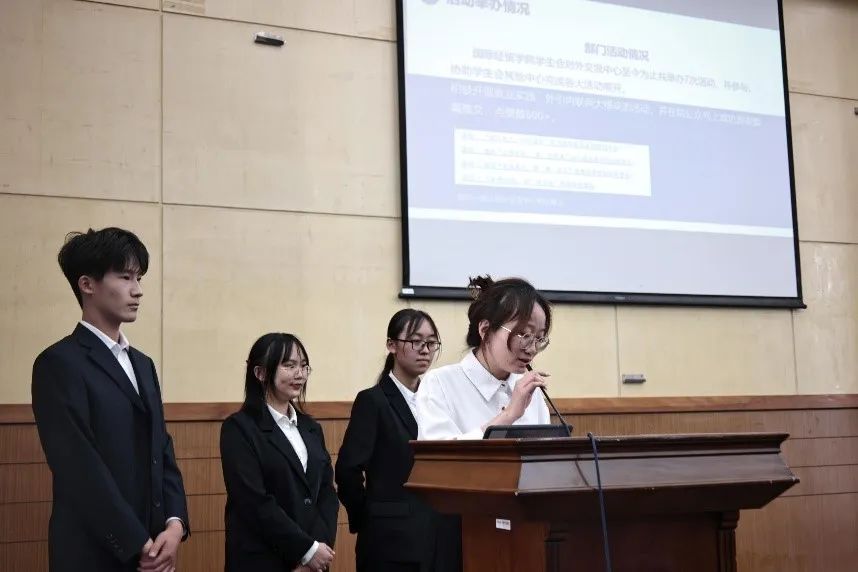 随后,学生会主席徐骏代表主席团进行了总结发言。他回顾了这一年来学生会的工作,赞扬了各部门之间相互配合,互相合作的友好工作氛围,同时也对未来工作提出了自己的建议。