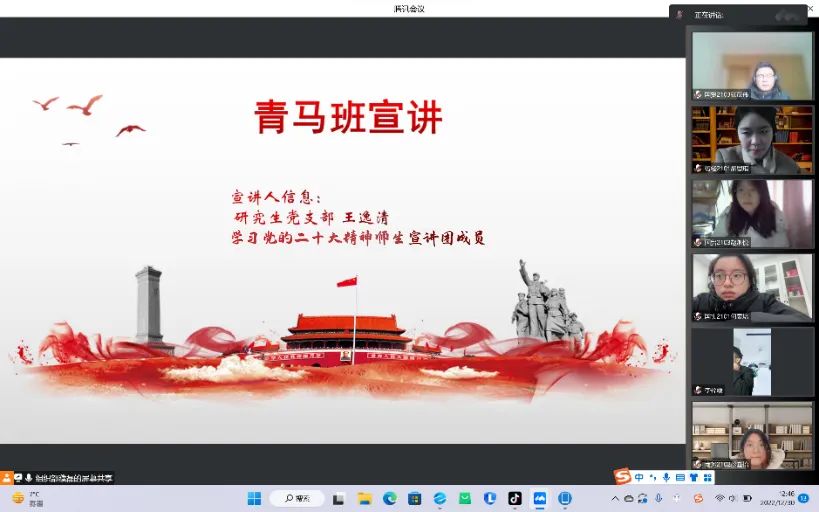 近日,学习党的二十大师生宣讲团成员、研究生党支部的王逸清同学以线上会议的形式组织开展了宣讲会,本次宣讲会以深入贯彻学习习近平新时代中国特色社会主义思想,锤炼忠诚、干净、担当的政治品格,为实现中华民族伟大复兴的中国梦不懈奋斗为主题,一本道