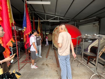 实践队员进入大鼓储存仓库参观。据非遗传承人曾胜利介绍,留左大鼓的名字源于其发源地——六合区一个名为“留左”的村落。其历史可追溯至隋唐时期,,是古代军营用于提振军威、庆祝胜利的重要军乐形式。“大鼓军用,小鼓民用”,留左鼓乐是连接军营与民间、共庆胜利的独特纽带。历经千年岁月流转,留左大鼓逐渐沉淀为南京六合地区极具代表性的民间音乐形式,承载着厚重的历史文化记忆。