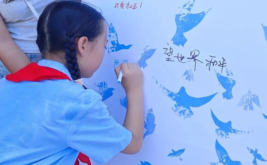 走出展厅,实践团队在馆外设置“鉴史铭初心,执笔书和平”留言板,邀请参观纪念馆的游客、市民写下心得感悟。活动中,不同年龄层的参观者纷纷驻足参与:小学生用稚嫩笔迹写下“希望世界和平”;中年人倾诉对历史的铭记与对和平的珍视;老者则以深沉文字传递爱国与警示之意 。通过留言,我们听到了更多人对历史的铭记、对和平的呼唤,这也让我们的实践更有意义——用行动搭建起传递爱国精神、凝聚和平共识的桥梁。