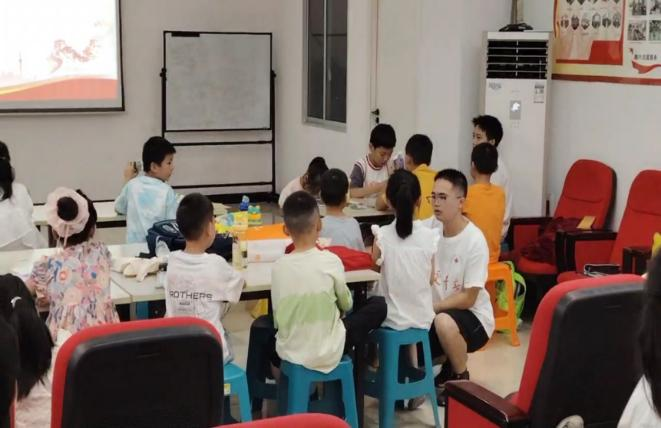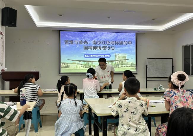 7月24日,为传承发扬这份爱国精神,实践团在四川省广安市广安区广福街道周家巷社区为暑期托管班的孩子们带来了一堂以“苦难与荣光:南京红色地标里的中国精神铸魂行动”为主题的跨越时空的爱国童心党课,为40余名小朋友深情讲述英烈故事,用红色文化为童心烙下爱国印记。活动中,孩子们变废为宝,用废旧材料制作“南湖红船”,五年级学生乐乐高举作品说:“我要像革命先辈一样,做新时代的小船夫!”伟人故里的红色基因,在家乡孩童的口中自然地流淌。当唐顺岩同学深情讲述南京雨花台烈士恽代英狱中坚守气节、邓中夏铿锵誓言、14岁渡江小英雄马毛姐血染船板仍六渡长江的感人事迹时,孩子们的眼睛闪烁着敬佩的光芒,课堂氛围既热烈又庄重。