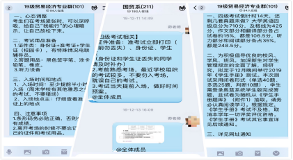 2019级辅导员老师在召开主题班会的同时,利用新媒体平台对学生进行谆谆教诲:考风考纪常记于心;从真题到分值,细心提示;证件、考场、时间及时提示;心态调整、考试用品温馨提醒。让学生“知其行,明其理”,吸取教训,完善自我,从而达到教育的最佳效果。