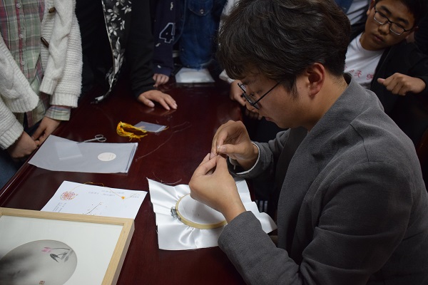 现场互动交流非常热烈,大家在张雪的指导下亲手拿起了针线和绷架。参加体验的潘同学说:“实在太奇妙了,一根普通的线可以分成几百股,一针针下去,可以出现这么精妙的图案,真可谓是用一针一线绣出来的文化传承呀!”一直围在张雪身边的陆同学表示:“张雪真的好棒,在文学爱好的基础上发挥了国贸专业的思维,永远积极主动在创新,以创新为乐,这是我们平常很难遇到的,这样的互动活动非常有感触!”
