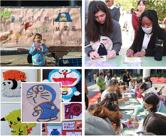 11月9日当天的“童年时光机“主题纸浆画活动包括纸浆画作品展示,纸浆画制作流程介绍,纸浆画现场制作,废纸污染介绍等,并设置了纸浆画制作体验区,