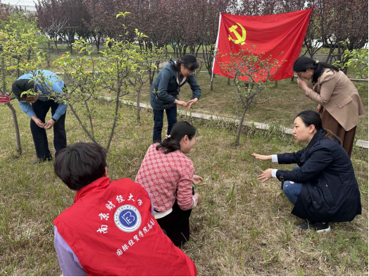 领导班子和学生党员热情高涨。戴上手套,拿好小铲,积极向后勤处工作人员学习修树除草技能与注意事项;三俩一组,干劲十足,兴致勃勃地开始修树除草,致力于打造一个美丽安全的校园环境。后勤处工作人员对所提出的疑惑进行逐一细致解答,弥补组织成员的知识空缺,形成良好的“党建+”融合联盟工作关系。