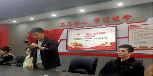 研究生党支部、研究生第二党支部组织党员在德经楼206集中学习领会党的二十届二中全会精神,重点学习讨论习近平总书记在党的二十届二中全会上关于中央政治局工作的报告、第二次全体会议上的重要讲话精神。