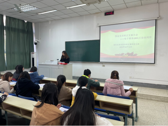 第四党支部在德经楼106室召开预备党员转正支部大会,讨论本支部王佳佳同志预备党员按期转正事宜,支部大会由第四学生党支部书记董敏主持,支部政治辅导员余泳泽副院长全程参加,支部应到党员24人,实到党员24人,其中有表决权的正式党员6人。