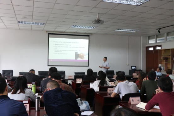 张小衡老师从教学目标、建设思路、理论框架、课程思政元素和案例、教学方法五个方面介绍了《国际贸易实务(英语)》课程思政建设的阶段性成果,并以“保险原则”为样例展示了思政要素与专业知识的有机融合。张老师认为,思政教学的原则是通过专业知识引出思政元素,利用思政元素提升专业知识层次。他将思政教学方法分为三种,一是线上线下结合,达到全面渗透;二是将思政元素与专业知识相结合;三是教师讲授与学生自学讨论相结合。这三种方法密不可分,相得益彰。